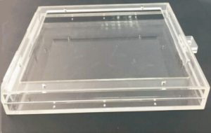 | Construido en acrílico transparente formado por un marco que se fija con cinta doble faz industrial o con tornillos y una tapa que pivotea con bisagra y permite bloquear con un candado el tablero y al mismo tiempo protege el display. Al ser transparente aun bloqueado se puede visualizar el display y es estado de los controles, |