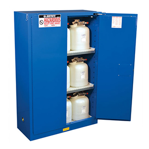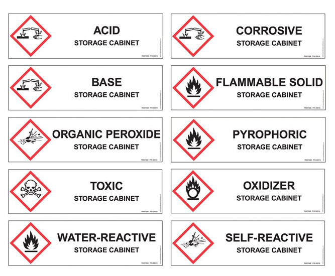Estos gabinetes están destinados a almacenar sólidos y líquidos corrosivos, sólidos inflamables, formulaciones de peróxido orgánico, sólidos y líquidos oxidantes, sólidos y líquidos pirofóricos, sólidos y líquidos tóxicos o altamente tóxicos, sólidos o líquidos inestables (reactivos) y sólidos reactivos al agua o líquidos. Asegúrese siempre de que los materiales incompatibles se almacenen en gabinetes separados y consulte a su autoridad de código local para cualquier otro elemento en cuestión. |