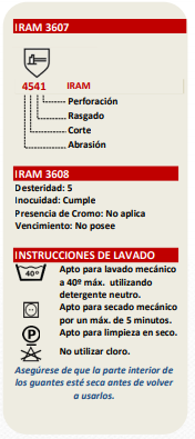 | Apto para lavado mecánico a 40º máx. utilizando detergente neutro. Apto para secado mecánico por un máx. de 5 minutos. Apto para limpieza en seco. No utilizar cloro. Asegúrese de que la parte interior de los guantes esté seca antes de volver a usarlos. |