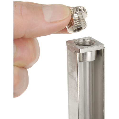 La mirilla muestra la cantidad de líquido que queda en un tambor de 30 o 55 galones (110L-200L). El medidor de tambor se instala fácilmente enroscándolo en un orificio de tapón estándar de ¾ "NPT y acepta cualquier grifo de ¾". El resistente cuerpo de hierro fundido galvanizado resiste un uso intensivo. |