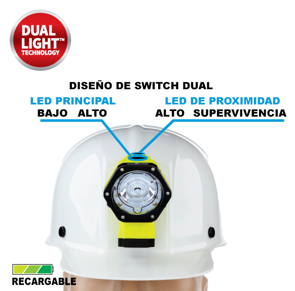 La lámpara de casco Dual-Light™ ATEX zona 0 recargable intrínsecamente segura y aprobada presenta funcionalidad de foco, reflector y luz dual. Este foco ofrece una luz de carretera de 90 lúmenes y una luz de cruce de 65 lúmenes. El proyector emite un haz de 70 lúmenes en alto y hasta 247 horas de tiempo de funcionamiento en modo Supervivencia. El modo Dual-Light™ emite un haz de 140 lúmenes con 9 horas de funcionamiento. Certificación intrínsecamente segura con cULus, ATEX, IECEX y MSHA como resistente al agua y al polvo. Alimentado por una única batería de iones de litio integrada. Incluye cargador montable. |