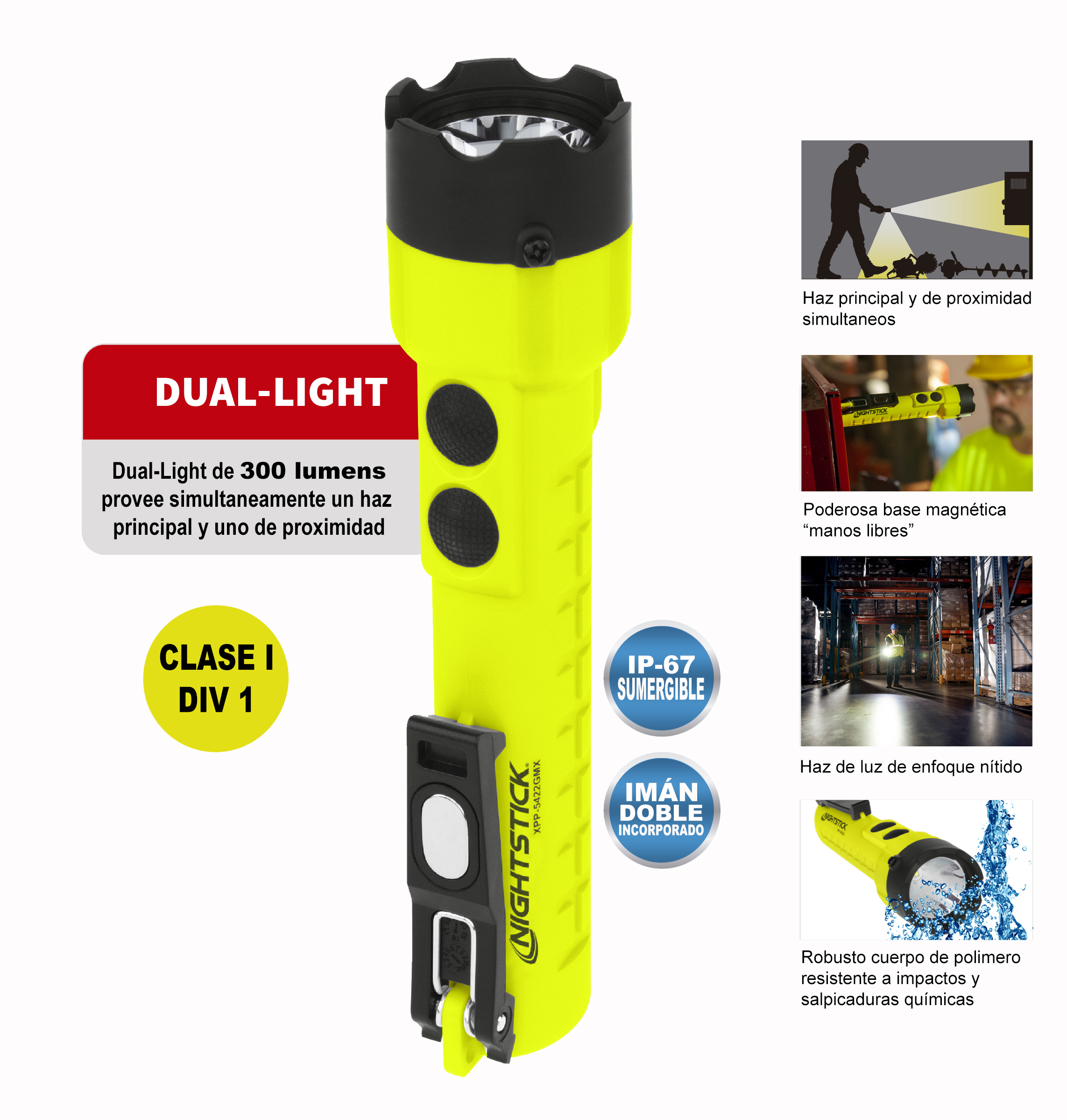 Esta linterna de doble luz está incluida en la lista ETLus como intrínsecamente segura para su uso en ubicaciones peligrosas tanto por encima como por debajo del suelo donde pueden estar presentes gases y polvo explosivos.
