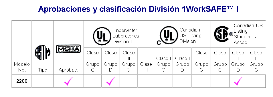 Características del producto • Para uso en atmósferas peligrosas • Aprobado por UL y CSA División 1 • Resistente a la intemperie • Reflector de gran tamaño para una mayor salida de luz • Mango del tamaño de un guante • Interruptor del tamaño de un guante • Compartimento de batería doble • 120° cabeza pivotante |