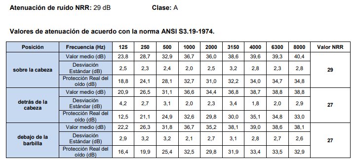 | Características: • Tecnología patentada Air Flow ControlTM para una óptima atenuación; • Construcción dieléctrica; • Posiciones múltiples permite al usuario seleccionar entre la posición sobre la baeza, detrás de la cabeza o debajo de la barbilla. Pueden usarse con cascos, protectores para la cara, respiradores y otros equipos de protección personal; • Almohadillas que se ajustan a presión y son reemplazables; • Banda de sujeción externa indeformable, de sujeción interna con ventilación; • Banda elástica para correta ubicación cuando se utiliza destrás de la cabeza o debajo de la barbilla. Aplicación: rotección del sistema auditivo del usuario contra niveles de presión sonora superiores al establecido en la regulación local, de acuerdo a la tabla de atenuación siguiente. |